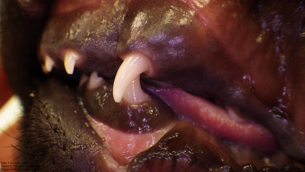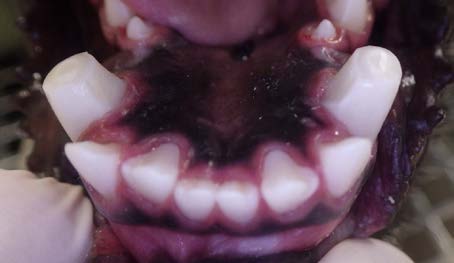 The lower canine tooth is centred in the space between the upper third incisor and canine teeth and is tipped labially at enough of an angle that it is not in direct contact with the maxillary soft tissue