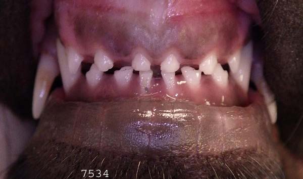 We see six upper and six lower incisors. The maxillary midline is directly above the mandibular midline and there is good symmetry right-to-left. The lower incisors are just behind the upper (scissors occlusion). The width of the mandibles is also appropriate compared to the maxilla.